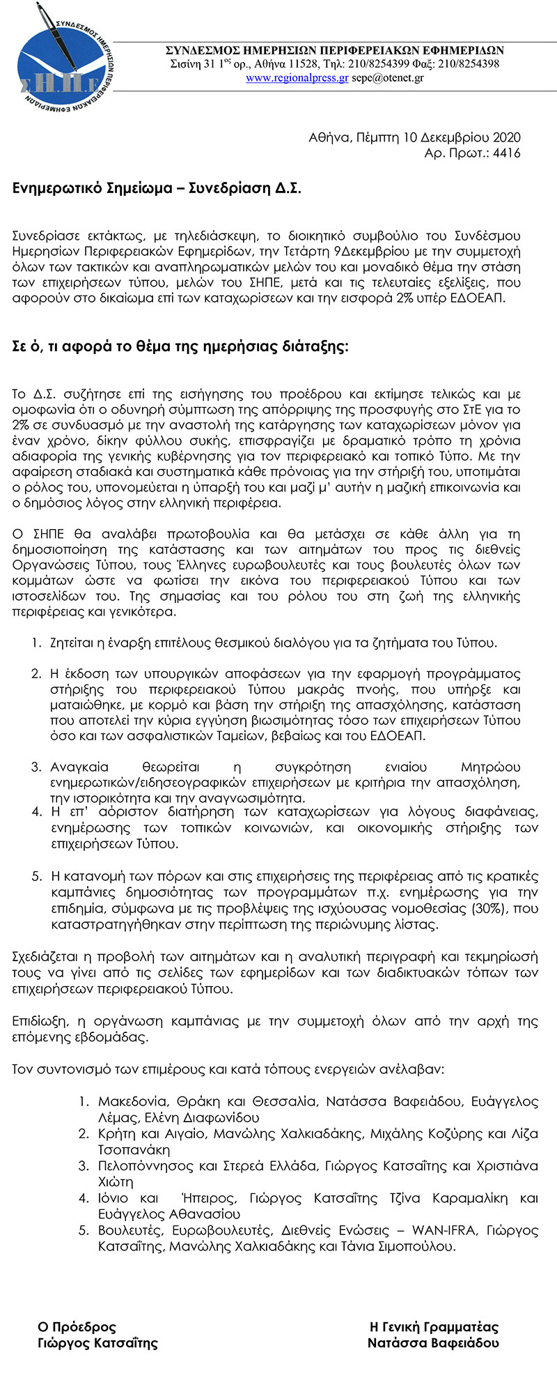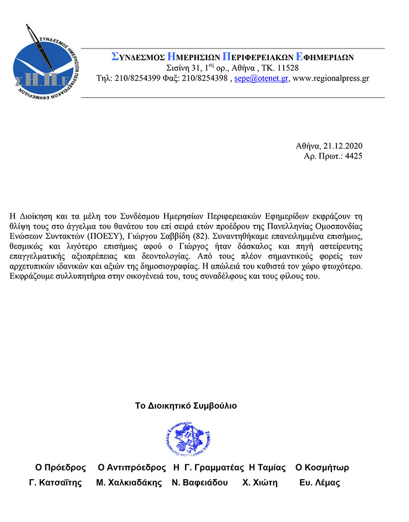 Η Διοίκηση και τα μέλη του Συνδέσμου Ημερησίων Περιφερειακών Εφημερίδων εκφράζουν τη βαθιά θλίψη τους, για την απώλεια του εκδότη Δημήτρη Ρίζου του ΛΑΜΙΑΚΟΥ ΤΥΠΟΥ την παλαιότερη εφημερίδα της Λαμίας που εκδίδεται από το 1939 έως σήμερα.