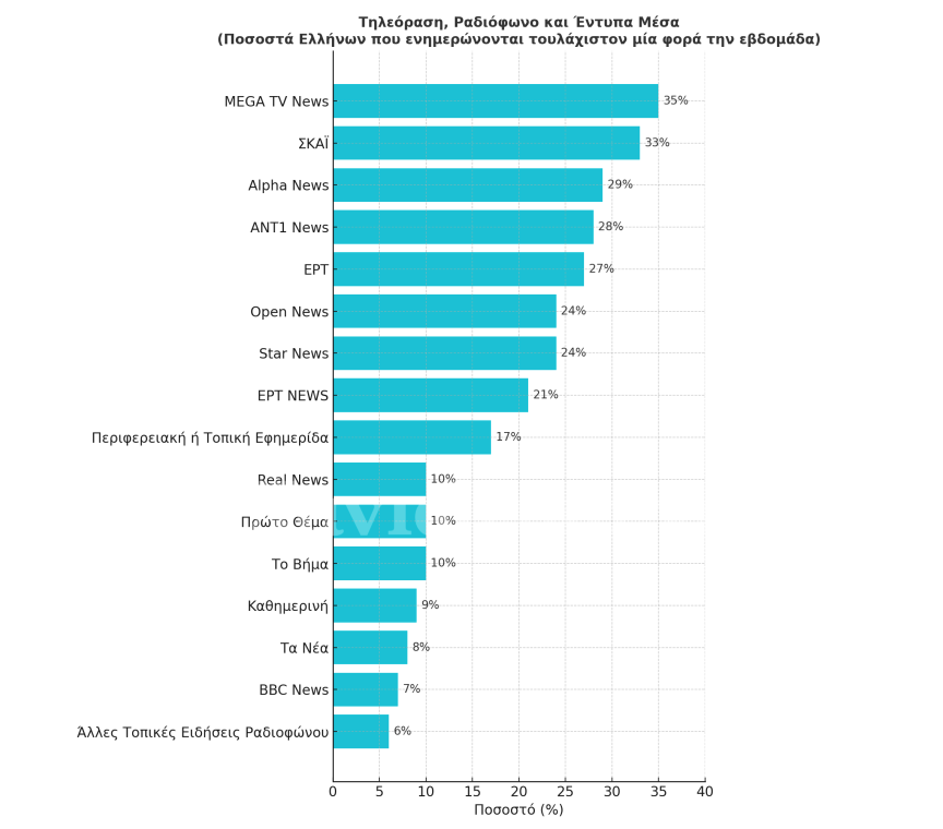 Από τις εφηµερίδες µέσω των οποίων ενηµερώνονται οι Έλληνες τουλάχιστον µία φορά την εβδοµάδα, η τοπική εφηµερίδα έρχεται µακράν πρώτη µε ποσοστό 17%, ενώ ακολουθούν η Real News, το Πρώτο Θέµα και το Βήµα µε 10%, η Καθηµερινή µε 9% και τα Νέα µε 8%.