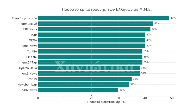 Μεγάλη πρωτιά για τον Περιφερειακό Τύπο και στον τοµέα της εµπιστοσύνης των πολιτών απέναντι στα Μ.Μ.Ε., µε την τοπική εφηµερίδα να καταγράφει ποσοστό εµπιστοσύνης 49%,, το µεγαλύτερο στην Ελλάδα, αφήνοντας στη δεύτερη θέση την εφηµερίδα ‘‘Καθηµερινή’’ µε ποσοστό 43%, ενώ ακολουθούν η ΕΡΤ µε 42%, και το in.gr, ο ALPHA και το MEGA µε ποσοστό 40%.